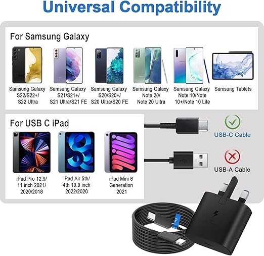 أو شاحن سامسونج الأصلي فائق السرعة بقوة 45 وات متوافق مع هاتف سامسونج جالاكسي S25 ألترا S24 S23 S22 S21 أسود مع كابل من النوع C ومحول